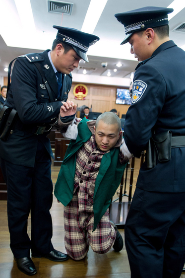 【安医大图书馆杀人案】2014年2月20日,“安医大图书馆杀人案”在安徽省高级人民法院二审开庭。庭审现场,院方对被告人胡某的犯罪过程和犯罪动机进行了进一步核实问询,因该案案情重大,未进行当庭宣判。图为当天庭审结束前,被告人胡某突然反身向被害人家属下跪谢罪。3月24日,该案件二审宣判,安徽省高级人民法院以故意杀人罪判处被告人胡恒江死刑,剥夺政治权利终身。 虞俊杰/东方IC
