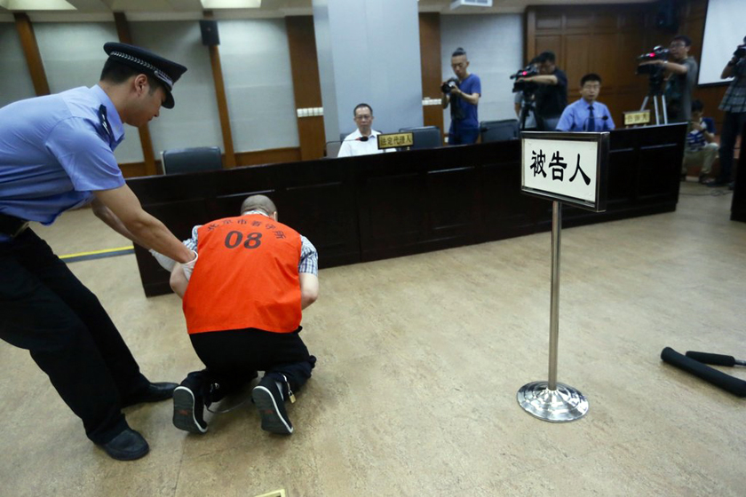 【父亲砍死追星女儿案】2014年6月12日,北京市第二中级人民法院对李进全杀害自己亲身女儿案作出一审判决。判处李进全有期徒刑12年,李进全因自首并获得亲属谅解而获得轻判。图为李进全听到法官宣读的判处结果后,跪倒在岳父面前不停道谢。被害的13岁女孩因沉迷追韩星而耽误学业,发脾气时称“爱明星比爱父母重要”,父亲李某在和女儿争吵后失控,持刀将女儿砍死。CFP