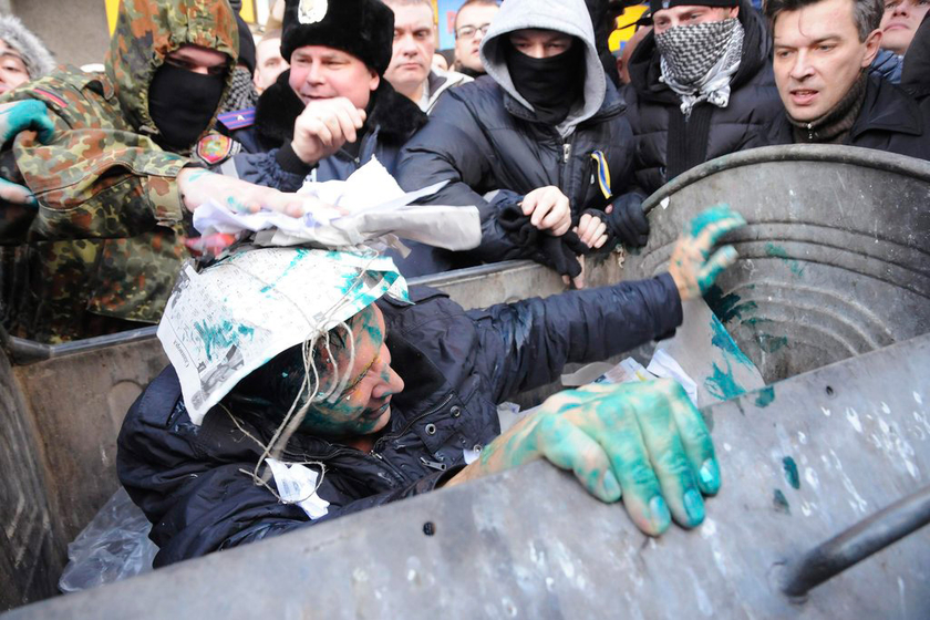 当地时间2014年12月24日,乌克兰哈尔科夫,示威者在议会大厦外集会,要求市长Gennady Kernes辞职,他们将哈尔科夫市议会代表Vladimir Skorobagach装进垃圾桶。 CFP