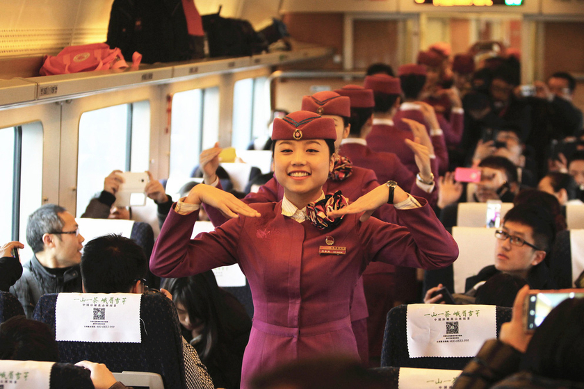2014年12月20日,成绵乐客运专线正式开通运行。图为动车乘务员表演微笑操。 东方IC