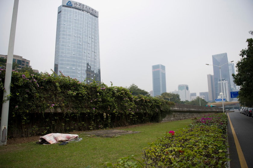 2014年12月23日,广东深圳,一名流浪者裹着被子睡在天桥旁的绿化草坪里。 陈文才/CFP