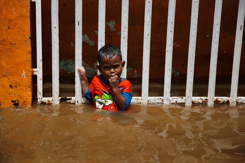 当地时间2014年12月23日,印度尼西亚雅加达,连日降雨引发洪涝。图为一名小男孩站在积水中。 CFP