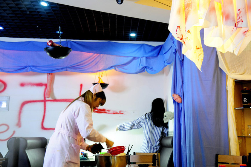 2014年11月23日,辽宁沈阳,一家“恐怖医院”主题火锅店。店内院长、大夫、护士为顾客提供服务,每位顾客还要“签署”一份“生死状”。 CFP