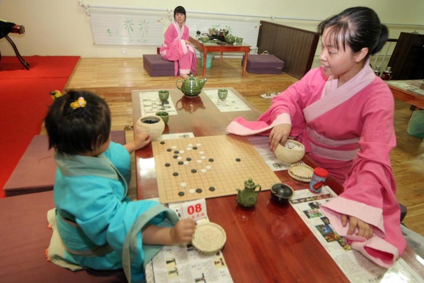 2007年6月23日,北京一家名为“汉风食邑”的汉文化主题餐厅里,顾客身穿汉服在下棋。这家餐厅以汉代风格装修、布置,顾客需穿汉服就餐。餐厅还会为顾客举行传统文化礼仪传授和汉服展示等活动。 南山/CFP