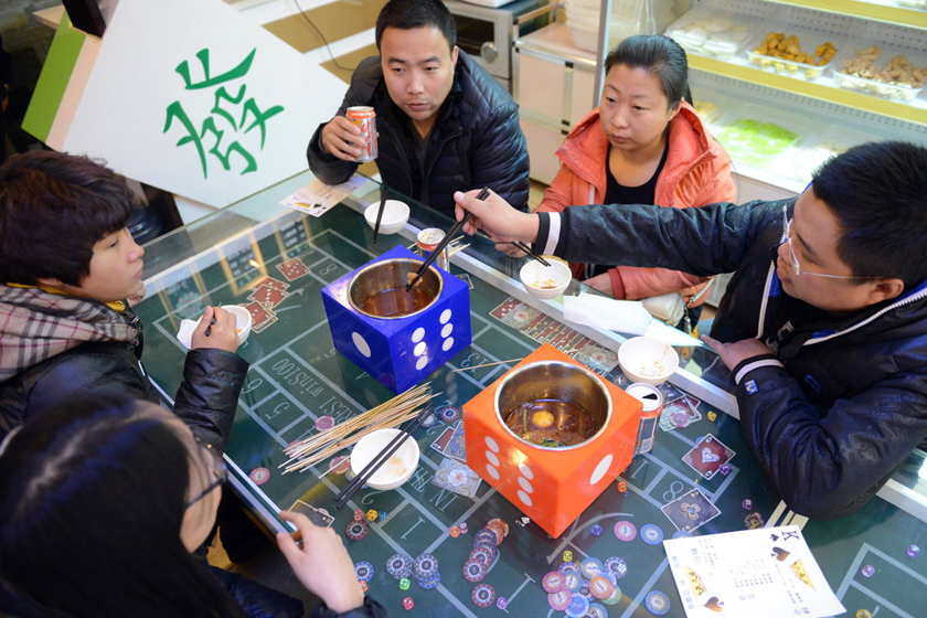 2013年12月20日,山西太原食品街,顾客在一家名为“肚一把”的主题餐厅用餐。这家餐馆的装修风格酷似“赌场”,餐厅内的点餐单、餐具也类似赌场的扑克牌、骰子,吸引了不少年轻人来此就餐猎奇。 刘江/CFP