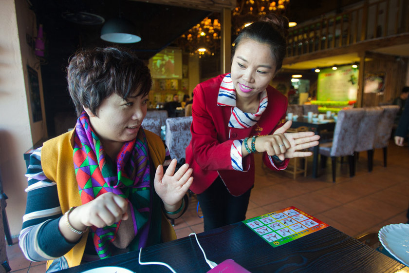2015年1月13日,吉林长春,长通路上的一家“无声”主题餐厅内,服务员在教顾客手语。这家火锅店里的服务员都是聋哑人,顾客想叫服务员,可以按桌上的铃,服务员手腕上的震动腕表就会显示相应餐桌的号码。每张餐桌上还贴有12个手语图示,基本涵盖了顾客的点餐需求。 CFP