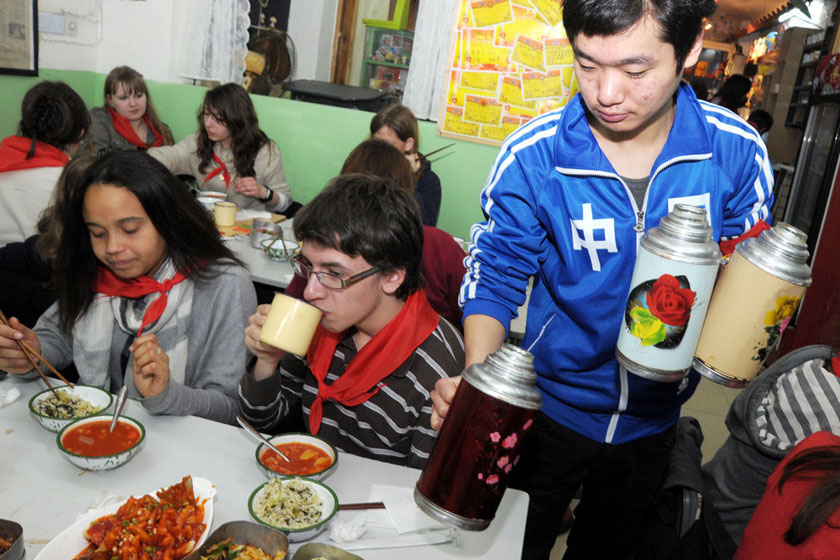 2012年2月21日,上海一家名为“希望小学堂”的“80后”主题餐厅内,服务员在为“同学”服务。餐厅内部被布置成教室、服务员称为“值日生”、顾客称“同学”,80年代的麦乳精、罗宋汤、搪瓷杯、红领巾等一应俱全。 钮一新/CFP