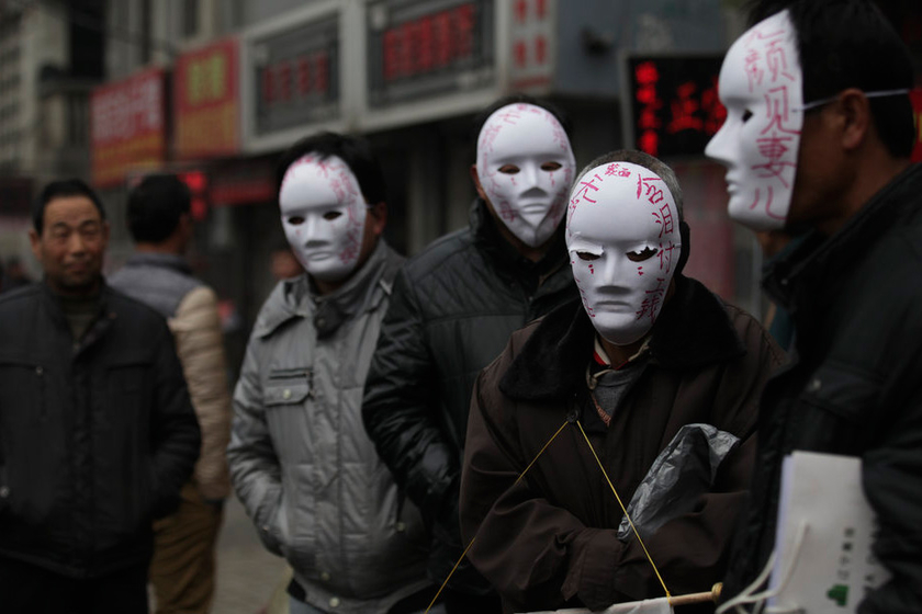 几名戴着白色面具的农民工在陕西省水利厅的门前讨薪。 陈团结/CFP