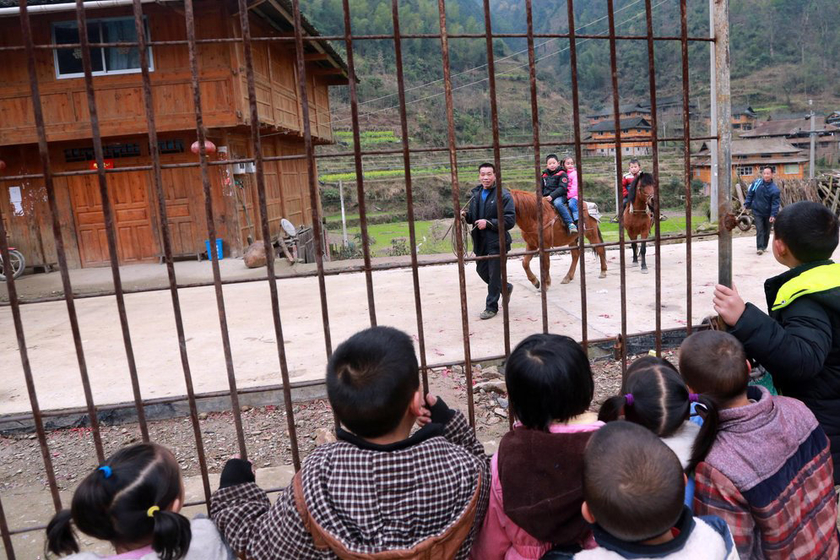 在这“云山之巅”中,有三个8岁的孩子——石黄军、黄陈斌和黄凌燕,在琉璃村教学点上一年级。他们的家距离教学点约8公里,全是泥石路。三个孩子的父母都在广东打工,老人们不懂骑摩托车,三年来,他们只好用马运送孩子们上学。