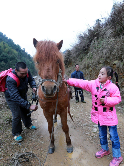 在这“云山之巅”中,有三个8岁的孩子——石黄军、黄陈斌和黄凌燕,在琉璃村教学点上一年级。他们的家距离教学点约8公里,全是泥石路。三个孩子的父母都在广东打工,老人们不懂骑摩托车,三年来,他们只好用马运送孩子们上学。