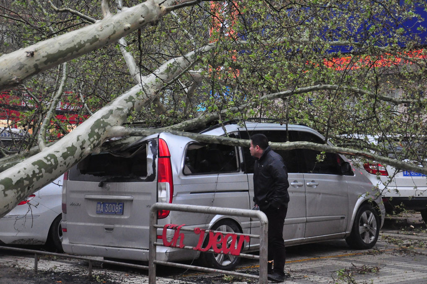2015年4月1日,河南郑州刮起大风,一棵60年树龄的法国梧桐树突然倒下,砸中四辆轿车,其中一辆商务车损伤严重。李四信/东方IC