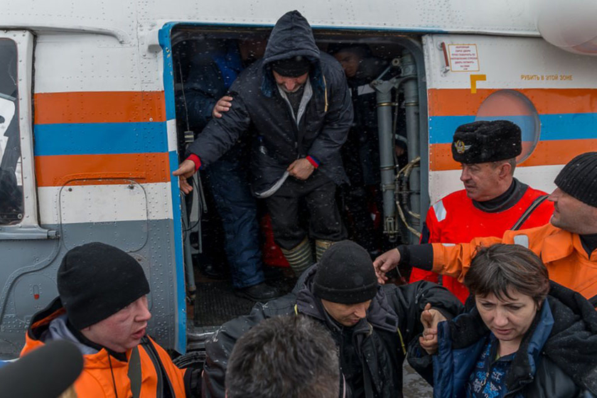 - 当地时间2015年4月3日,俄罗斯马加丹,俄罗斯紧急情况部成员护送“远东”号渔船幸存者下直升机。2日,俄罗斯一艘载有132人的大型拖网渔船沉没,当局救起117人,其中56人证实死亡,部分伤者由直升机送院救治,其中约10人因体温过低,情况危殆,仍有15人下落不明。CFP