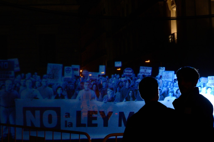- 当地时间2015年4月10日,西班牙马德里,西班牙人以全息图的方式虚拟游行经过马德里的议会大厦,抗议一项被认为危及公民自由的新法律。西班牙政府去年通过了一项法律,对在政府大楼外举行的未获当局许可的游行集会设置高额罚款,而其中政府建筑涵盖了医院和学校,违反这项法律的组织者将面临最高60万欧元的罚款。受争议的公民安全法律将于7月1日生效,为了抗议这项法律,西班牙活动人士举行了世界上第一个虚拟政治示威。Czuko Williams/东方IC