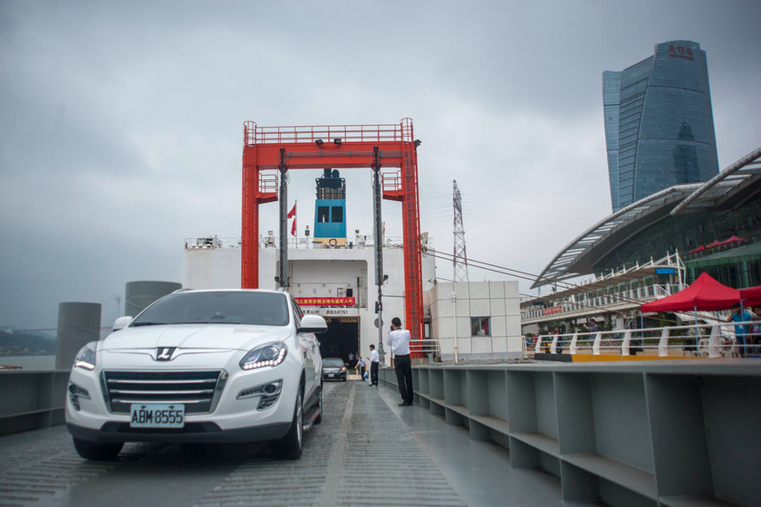 2015年5月4日,福建厦门国际邮轮中心码头,两辆悬挂台湾地区车牌的汽车“登陆”,八名台湾游客开始了为期四天三夜的闽西南自驾踩线之旅,这也是台湾自驾车首次经厦入闽开展海峡两岸自驾车旅游踩线活动。图为台湾自驾车辆驶出船舱。 沈宇波/CFP