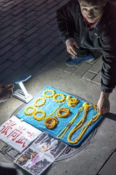 2005年大运会体操冠军张尚武受伤退役。2007年因偷窃被判刑,刑满释放后在石家庄、天津、北京卖艺乞讨。2011受聘于陈光标的公司,110天后辞职。在辗转了几份工作之后,2012年7月,他重回街头卖艺。图为2015年5月,张尚武在北京三里屯路边摆摊卖手串。 刘洪印/CFP