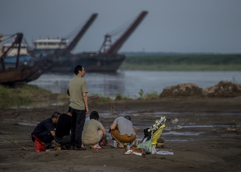 2015年6月6日,“东方之星”客轮翻沉事件的遇难者家属来到监利县江边悼念逝去的亲人。 新华社