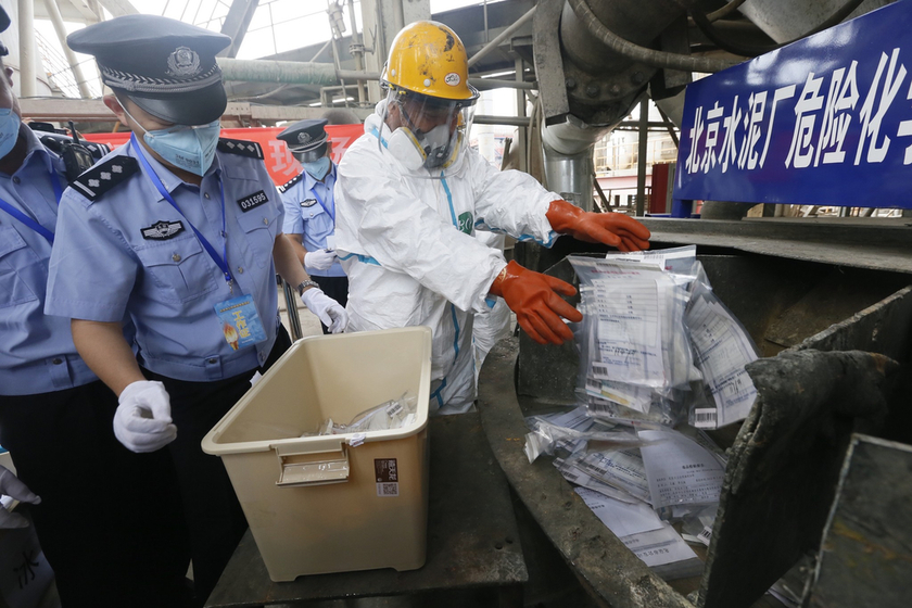 2015年6月9日,北京市公安局在北京水泥厂的化学危险物品销毁区,将两年来收缴的630公斤毒品、4000余支杜冷丁针剂及6000余株毒品原植物集中销毁。 曹博远/东方IC