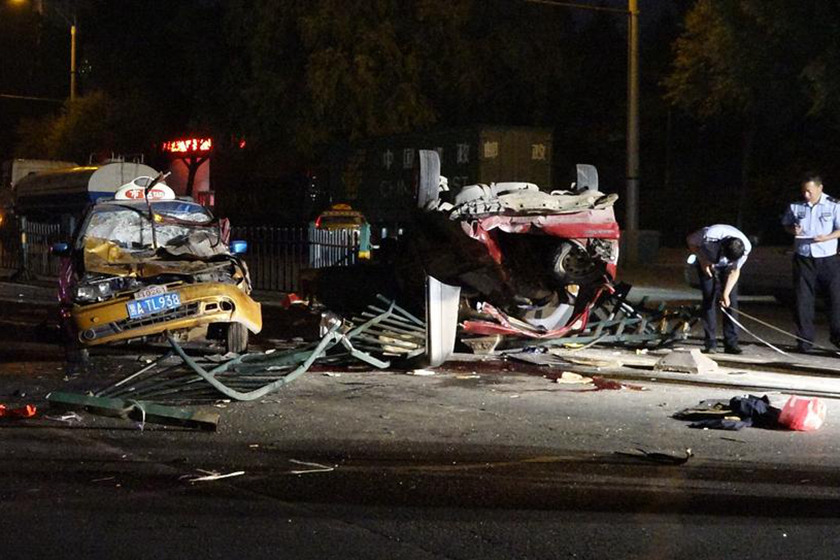 2015年6月25日0时20分许,黑龙江哈尔滨,一辆轿车追尾一辆水罐车失控后,撞破多节隔离护栏驶入对向车道,并与对向车道一辆出租车相撞,造成4人死亡,5人受伤。 CFP