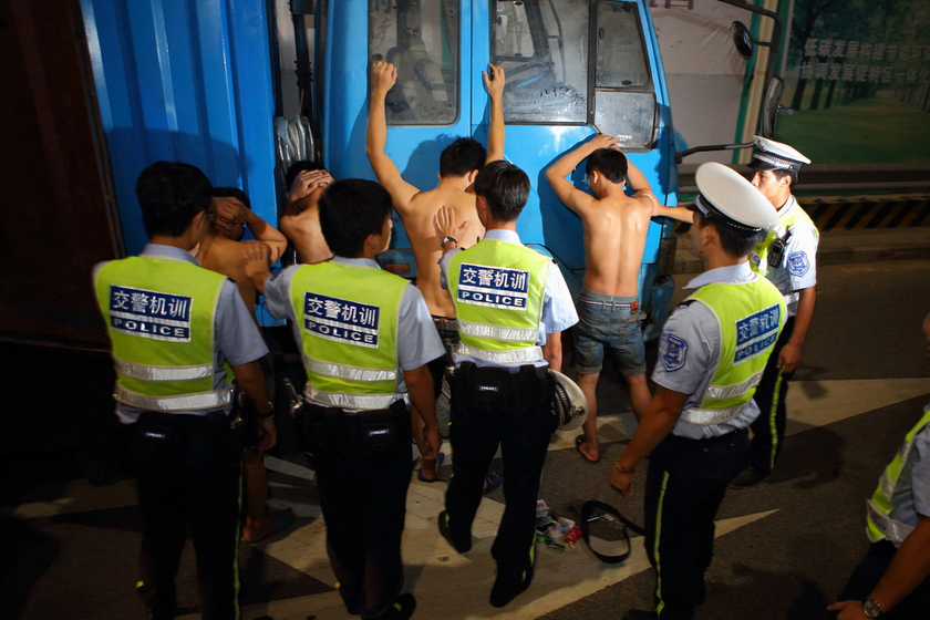 2015年7月7日凌晨,广东深圳,深圳交警机训大队等多部门联合执法,查获三辆非法改装的“移动生猪私宰车”,抓捕多名涉案人员,查获大批涉案工具。嫌犯每日凌晨在原特区外收够未经过食品安全检验的私猪后,途中宰杀,再运送至农批市场,每次宰杀生猪十余头。 mayokyo/东方IC