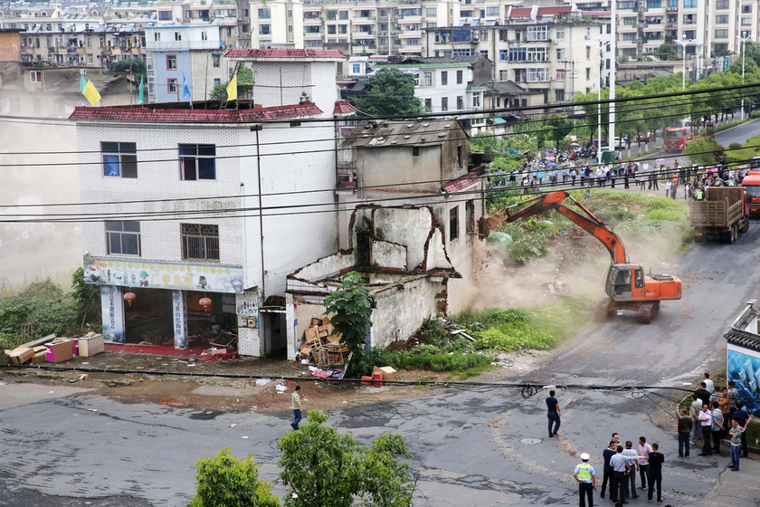 2015年7月9日上午10时,安徽省黄山市新园路与仙人洞路交汇口处,在民警、武警、交警及城管等超300人的戒备把守下,拆迁人员对一处“钉子户”三层楼房进行强行拆除。该“钉子户”未与开发商达成补偿协议,因而拒绝搬迁,已有三年。 吴孙民/东方IC