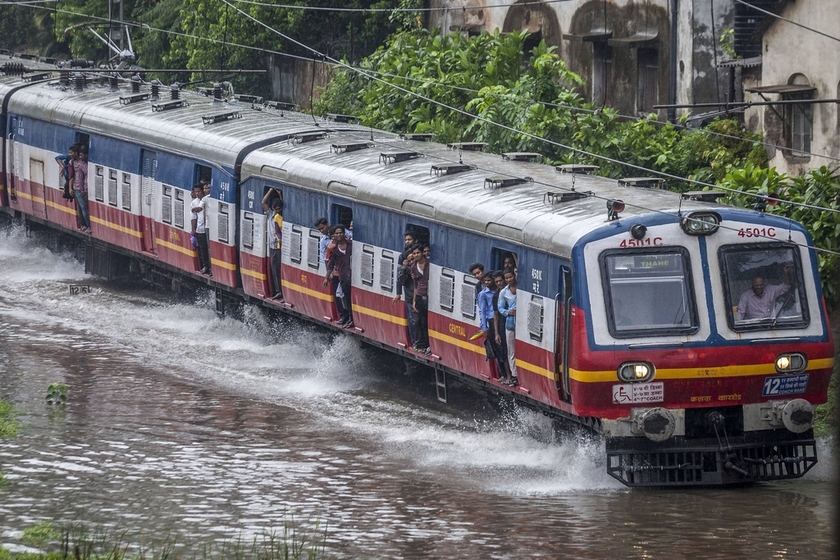 当地时间2015年7月21日,印度孟买,火车在遭水淹的铁轨上行驶。据报道,受到暴雨的影响,印度至少有10人死亡,灾区有6000人被疏散,部分学校停课。 东方IC
