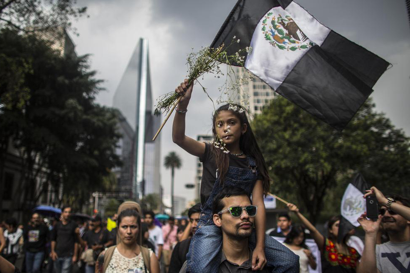 当地时间2015年8月2日,墨西哥首都墨西哥城,民众抗议摄影记者Ruben Espinosa遭谋杀,抗议者手持被染黑的墨西哥国旗和花束哀悼逝者。摄影记者Ruben Espinosa及另外四人的遗体于7月31日被发现,遗体头部中枪。一个月前,Ruben在接受采访时曾表示感到来自韦拉克鲁斯州东部官员的威胁。 Miguel Tovar/CFP