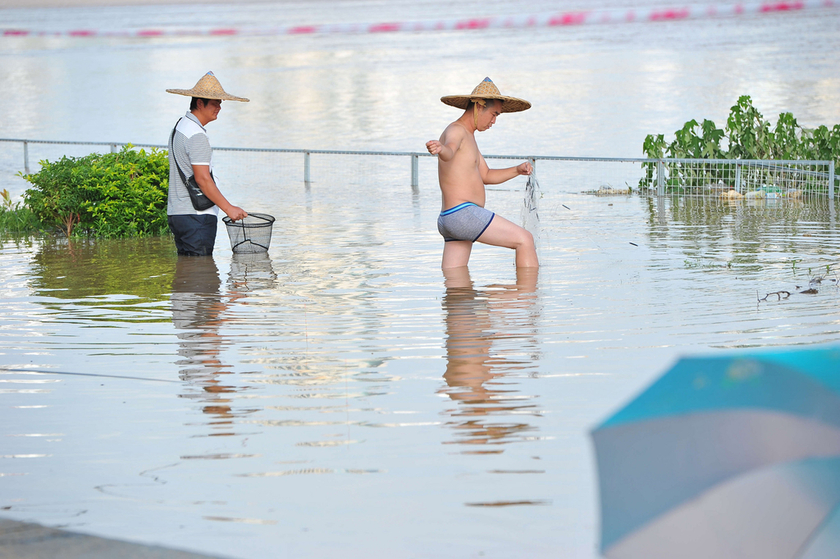 2015年8月4日,广西南宁,持续降雨致邕江水位暴涨,一江边公园被洪水淹没,市民在公园里拉网捕鱼。 东方IC