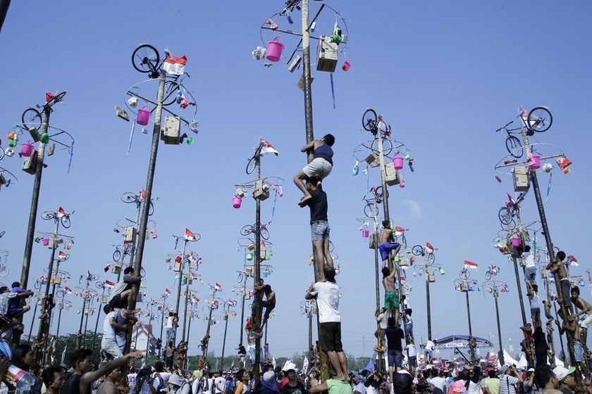 当地时间2015年8月17日,印尼雅加达,印尼全国于当天庆祝独立70周年。印尼民众参加爬杆大赛,以争夺位于木杆最顶端的奖品。 Tatan Syuflana/东方IC