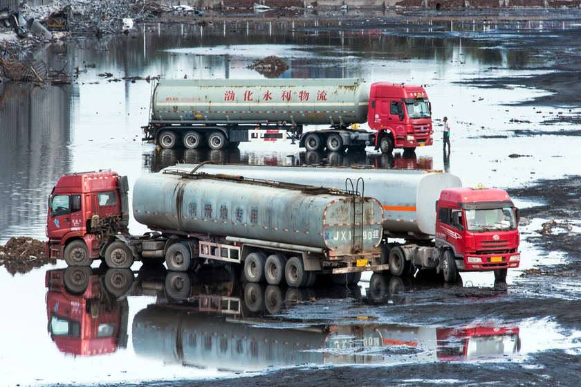 2015年8月24日,天津港“8·12”瑞海公司危险品仓库特别重大火灾爆炸事故现场核心区,抽水车正在作业。目前,事故现场的废弃物处理已全面展开,30余辆运输车、挖掘车、抽水车和起重车在爆炸形成的大水坑周边作业,进行管道铺设和积水清理。 小白/东方IC
