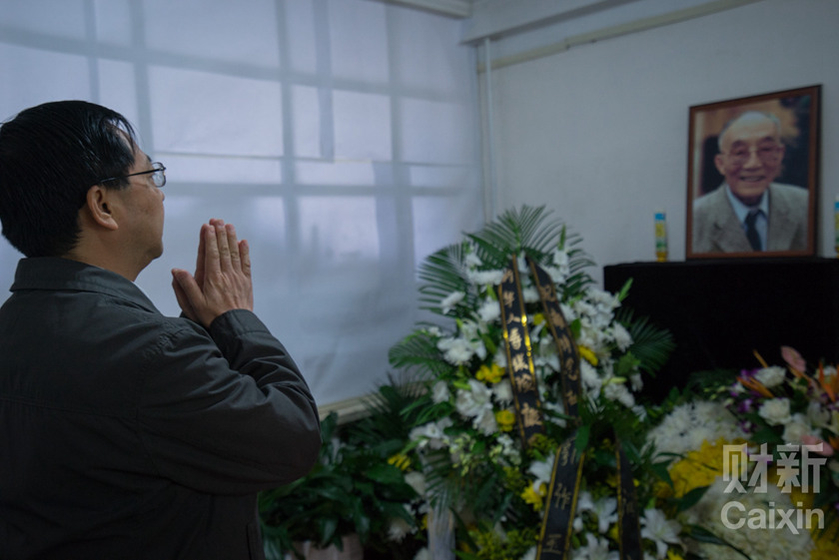 中农办副局长赵阳在杜润生的遗像前双手合十。 丛妍/财新见习记者