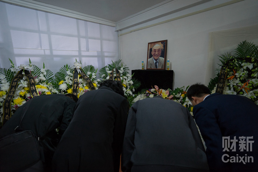 农业部离退休干部局代表前来吊唁,在杜润生遗像前三鞠躬。 丛妍/财新见习记者