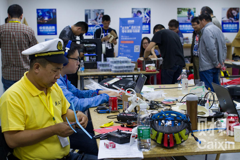 2015年10月19日,全国大众创业万众创新活动周开幕。中关村创业大街是分会场之一,在19日至23日5天时间内,这里会举行创意集市、“挑战48小时”软件赛、“挑战72小时”硬件赛、智能硬件节、全球创新路演等活动。“挑战72小时”硬件赛中,研制智能骑行头盔项目的成员在制作配件。 丛妍/财新见习记者