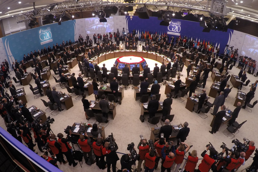 当地时间2015年11月15日,土耳其安塔利亚,G20峰会举行第一阶段会议。会议一开始,参会领导人全体起立,为法国巴黎恐怖袭击事件遇难者默哀。 Volkan Furuncu/东方IC
