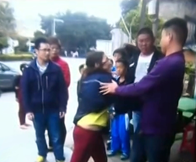 2015年12月14日,据广东电视台报道,12月12日下午,在广东省东莞市寮步镇的坑口村发生了抢小孩事件。一名中年妇女死死拉住一名7岁的小男孩不放,并大声呼叫:“还我小孩!”男孩挣脱开这名女子之后,还跑进附近商店的厕所躲了起来,这名女子不罢休追了上去,还打伤了小男孩的真正家人。图为事发现场视频截图,该名女子被控制。 东方IC