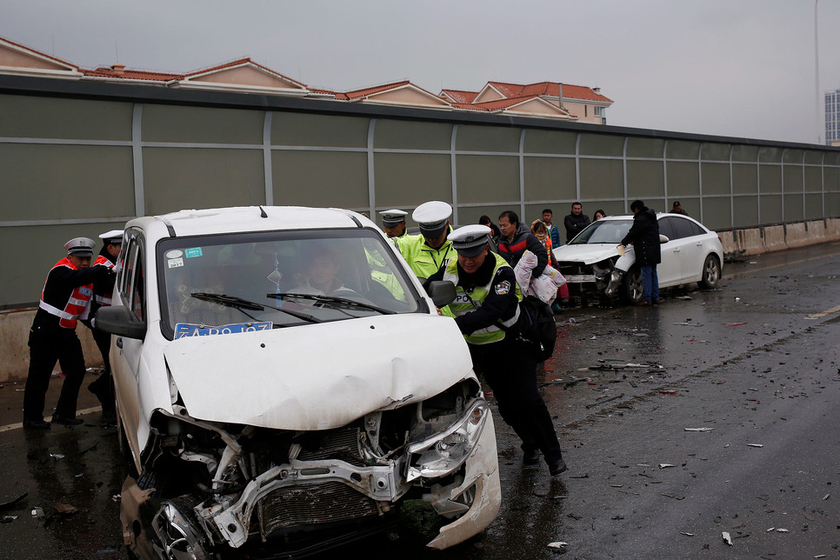 昆明二环高架54辆汽车相撞 因积雪路滑