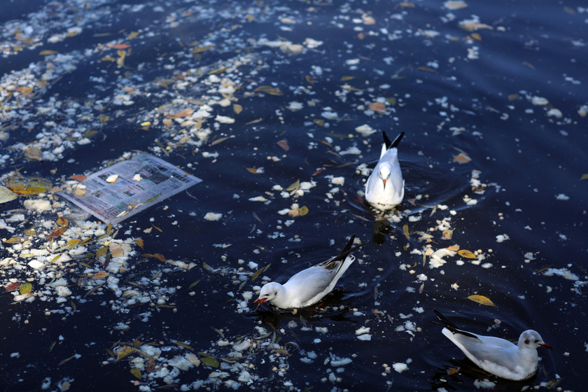 红嘴鸥在满是垃圾的湖面上觅食。 炎平/东方IC