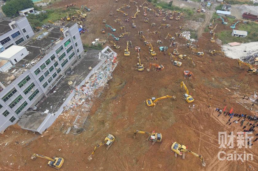 航拍深圳垮塌事故第三日救援现场,厂房一侧已被挖出。 财新图片
