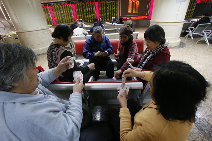 2016年1月7日,北京,股民在营业部内打牌。 郭谦/视觉中国