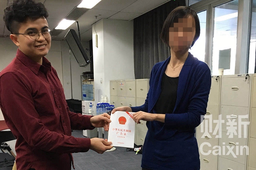 公益机构代表手持《广告法》在百度公司门前合影。 受访者供图
