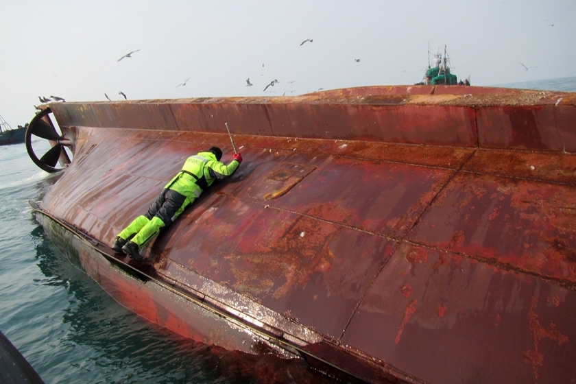 当地时间2016年1月27日,韩国,韩国木浦海洋警备安全署称,2016年1月27日上午,一艘中国渔船在韩国全罗南道新安郡黑山面可居岛西北方向85公里的海上翻船。船上共有10名船员,其中有4人已被中方渔船救起,其余6人还困在船内。据悉,该渔船因发生故障被另一艘中国渔船拖至中国海域,在途中突然倾覆。韩国木浦海洋警备安全署获知消息后,向事发海域紧急派遣搜救人员开展营救工作。 视觉中国