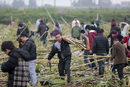 2016年1月27日下午,广东广州,在番禺榄核镇墩塘村的甘蔗田,不少市民在砍蔗。1月26日,墩塘村村民何某即将收获的10亩甘蔗被风吹后全部倒伏,遍寻商贩却无人问津。无奈之下,何某寻求网友帮忙,称5元一个人,可以任意砍甘蔗带走。第二天数百市民闻讯赶来,田里的甘蔗已收割大半。 黎湛均/视觉中国