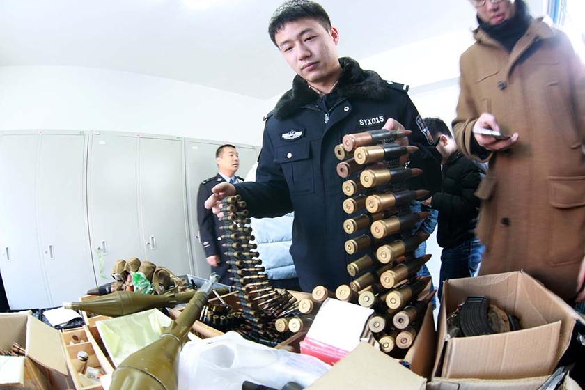 2016年1月27日,沈阳市公安局凌空派出所展示缴获的大量各类型的军用枪支弹药。 黄金崑/视觉中国