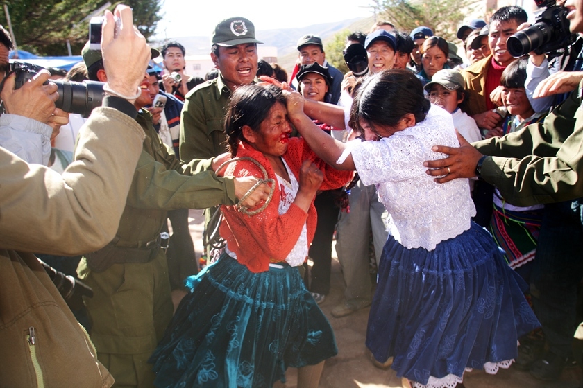 当地的男人和女人们穿着多彩的衣服参加这场暴力仪式,当地称这个节日为Machu Tinku。通过打架来讨得大地之神帕查玛玛的开心,祈求丰收。图为街头互殴的一对男子。 视觉中国