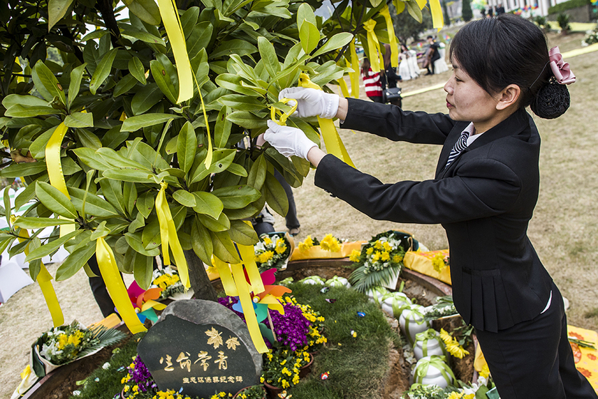 3月29日,安葬礼仪师在绿树上系上丝带祭奠逝者。当日,湖北武汉龙泉山孝恩园举行公益节地生态葬集体安葬仪式,共有27名逝者的骨灰回归自然。“生态葬”采用不留名、不立碑、骨灰不保留,使用降解骨灰盒落葬的方式,达到骨灰自动分解、回归自然、土地循环利用的目的。目前孝恩园有树葬、草坪葬等多种形式的绿色殡葬方式。 肖艺九/新华社
