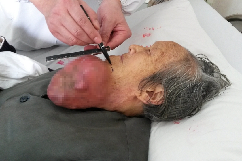 江苏省镇江市,丹阳九旬老人下颌处长了一个2.2斤重的肿瘤似“人头” ,5年前意外烧伤后越长越大,4月1日,经过近2个小时的手术,徐凤娣下颌处的肉瘤成功切除。经诊断为“下颌巨大间叶性肿瘤”,有1095克重,近2斤2两。 万凌云/视觉中国