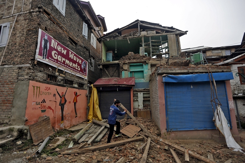 当地时间2016年4月10日,印控克什米尔斯利那加,警方查看在地震中被破坏的房屋。