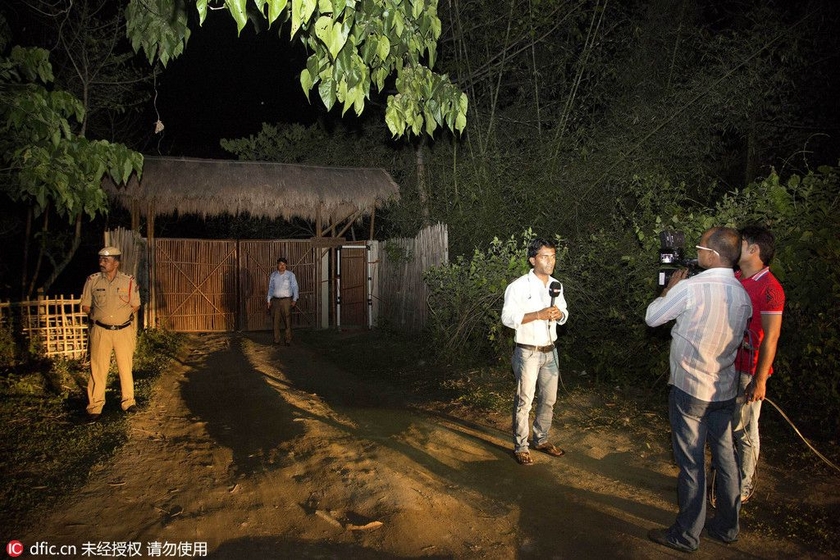 当地时间2016年4月13日,印度阿萨姆邦,一名电视台记者在威廉王子夫妇下榻的酒店外报道地震。据中国国家地震台网测定,缅甸发生7.2级地震。受此影响,中国西藏林芝市、日喀则市、拉萨市、山南地区等地震感强烈,印度的德里、加尔各答和古瓦哈提等城市都有震感。