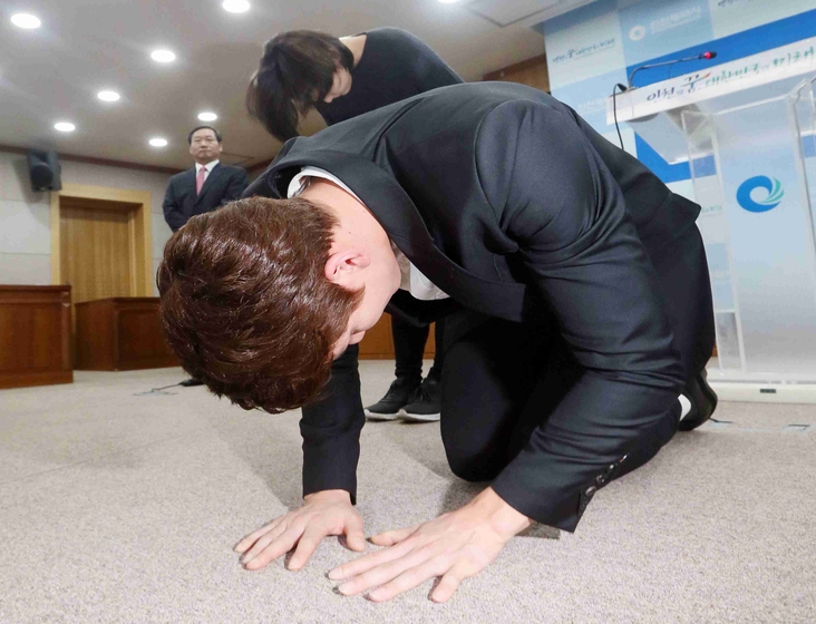 2016年5月2日,朴泰恒在记者会上下跪。当日,韩国游泳名将朴泰恒在仁川举行记者会上行跪拜礼,希望媒体帮忙呼吁,让韩国奥委会等机构给他参加里约奥运会的机会。朴泰桓去年3月因药检呈阳性被国际泳联禁赛18个月——自2014年9月起至2016年3月2日。如果按照该禁赛日期,朴泰桓还有希望通过国内奥运选拔赛取得里约奥运会的参赛资格。然而,根据韩国奥委会的禁赛规定,被查出服用禁药的运动员在国际泳联的禁赛期结束后的3年不得代表本国参赛。 视觉中国