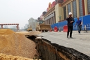 2016年5月14日,江西省南昌市,南昌地铁2号线八一广场站施工现场,施工人员正在对坍塌区进行砂石回填。当天凌晨四时左右,南昌地铁2号线八一广场站施工工地出现涌水涌沙,导致地面塌陷,路面形成直径长达10余米的大坑,附近交通和网络受到极大影响。 视觉中国