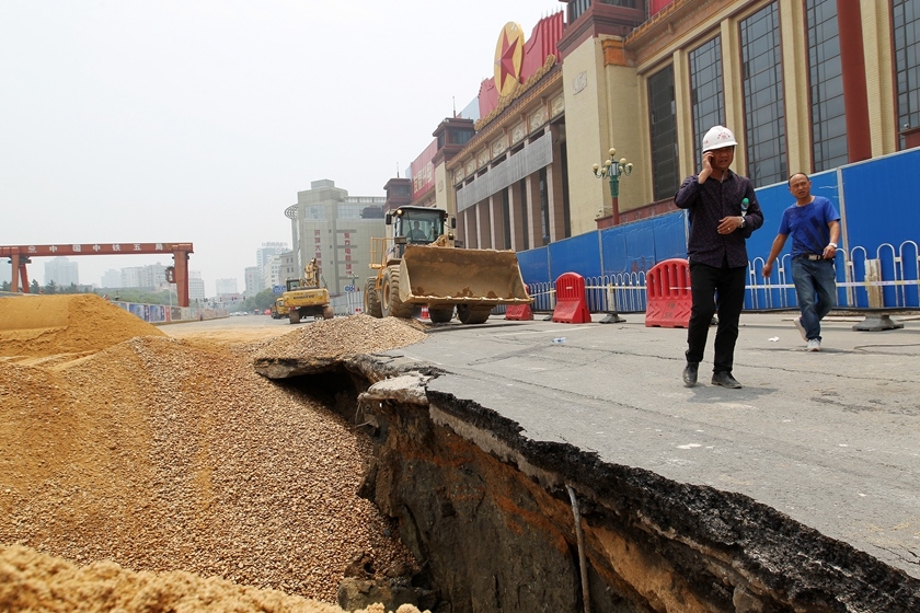 2016年5月14日,江西省南昌市,南昌地铁2号线八一广场站施工现场,施工人员正在对坍塌区进行砂石回填。 视觉中国